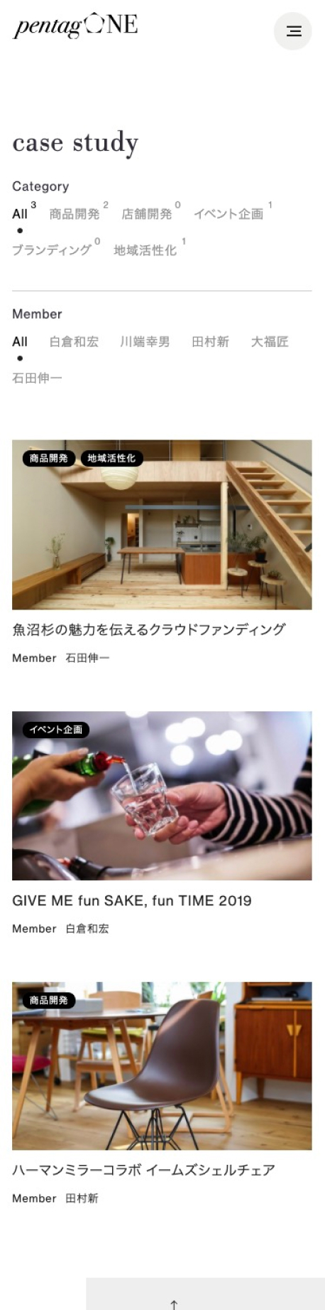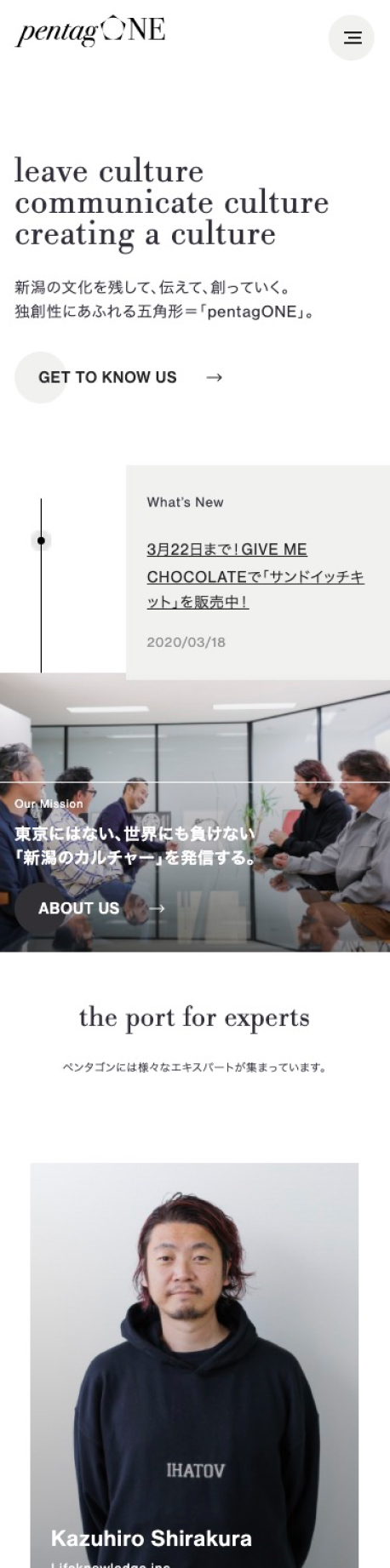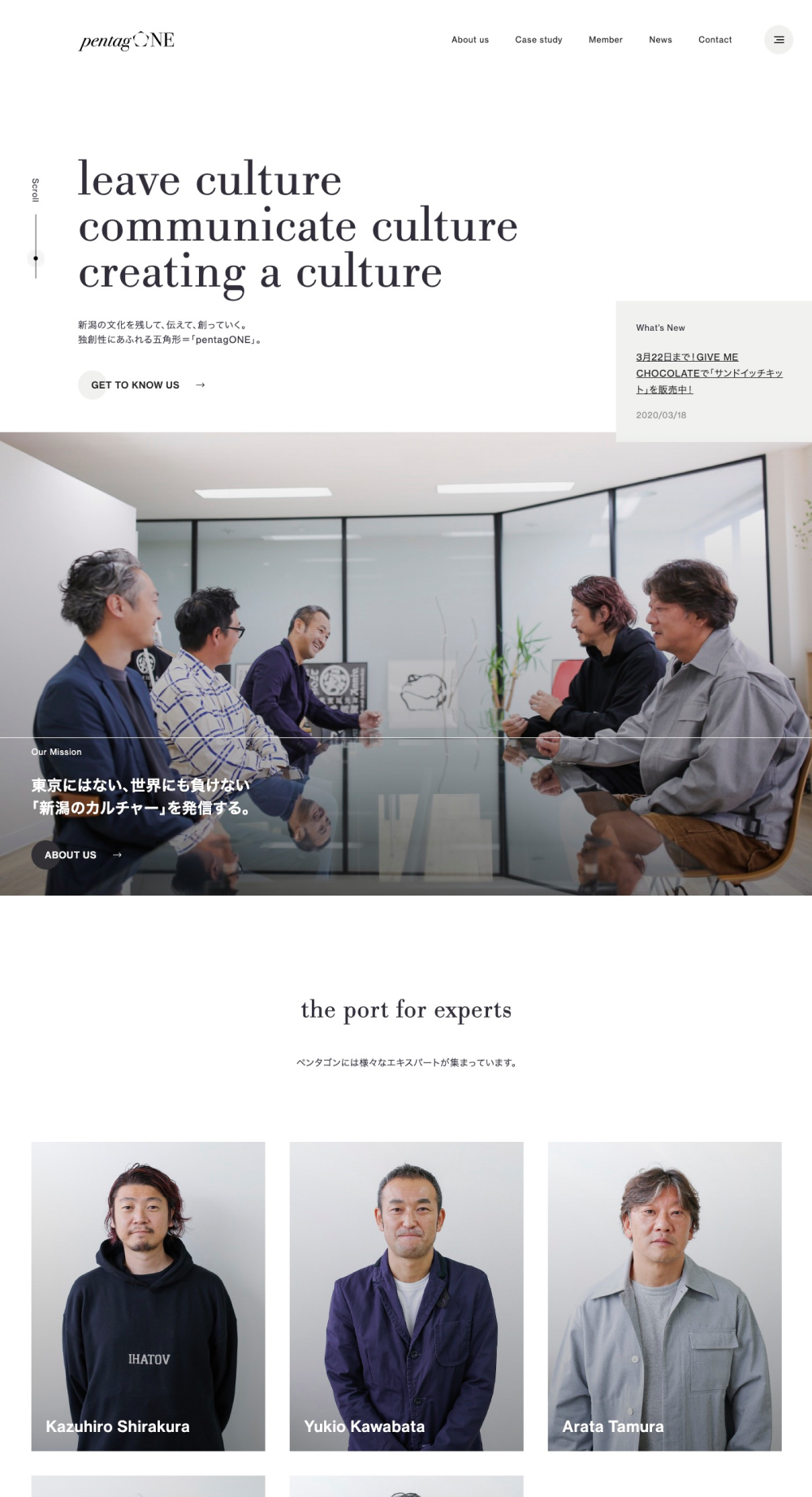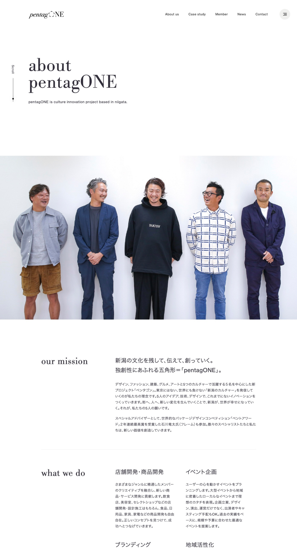 デザイン、ファッション、建築、グルメ、アートと5つのカルチャーで活躍する5名を中心にした新プロジェクト「pentagONE(ペンタゴン)」のWebサイト制作を担当しました。新しい取り組みとしての社会に対する認知を広げることと、メンバーの個性やチームの雰囲気を感じ取れるようなWebサイトになるよう考慮してデザインしました。