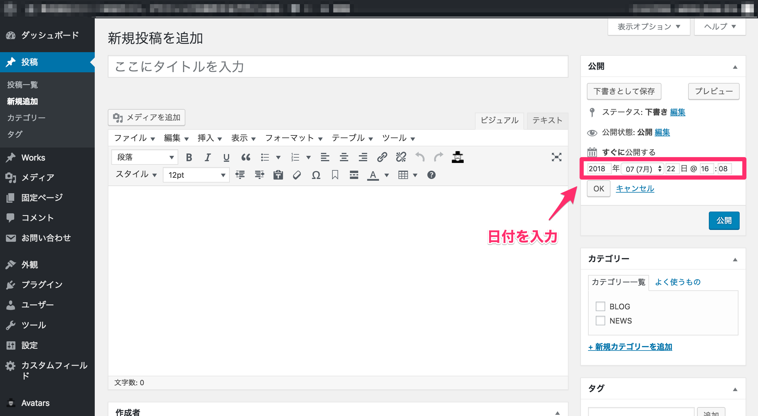 続いて、タイトルや本文を入力していきます。