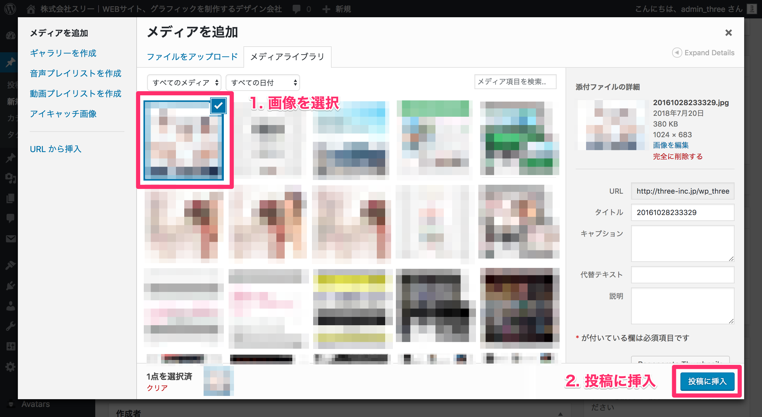 画像をアップロードしたら、表示させたい画像を選択して投稿に挿入を押します。