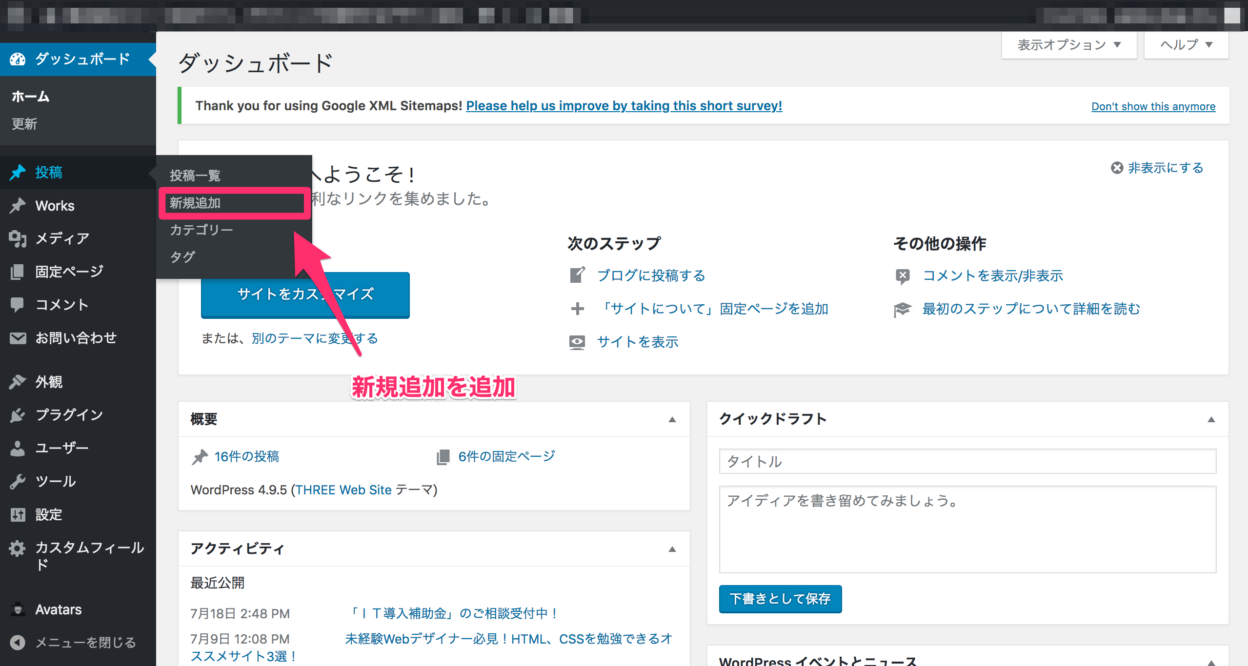 まず、左側のメニューから投稿をクリックして一覧を表示させます。